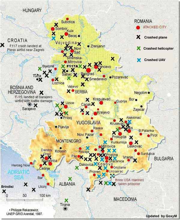 Ostecene / Oborene NATO letelicenad Jugoslavijom - mapa i tabela sa datumima (08-Jun-99). Damaged / Downed NATO aircrafts over Yugoslavia - map and data table (08-Jun-99) |
